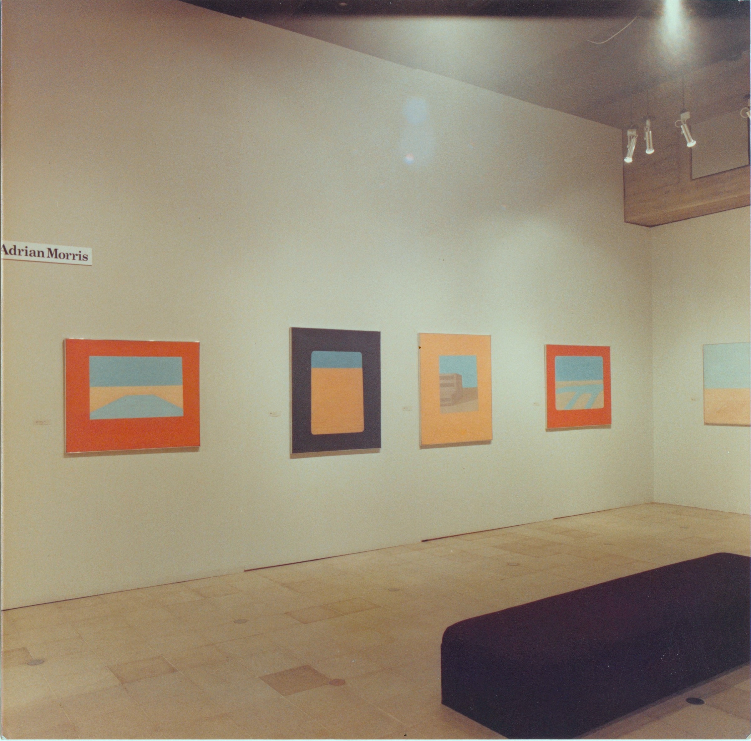 A unique contribution to the show, however, was a group of sixteen works by London painter Adrian Morris. They depicted horizons and flat planetary terrains, marked by traces of habitation or intervention, and often seemingly viewed through apertures from one zone to another. The works were loaded with absent presences, and sometimes concealed ghost images of human figures beneath the final paint surface. Though aged nearly fifty, Morris had exhibited rarely, and for some visitors his Hayward showing was a revelation.